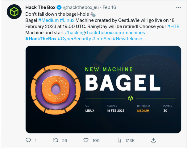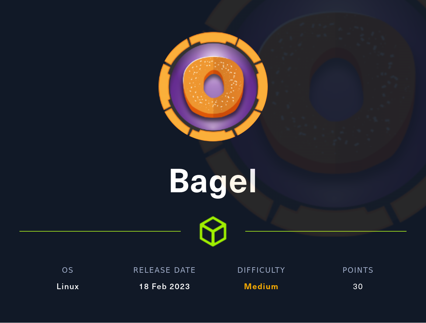 So what information can we gather about the box before even starting. The name of the box is Bagel. When I started an instance of the box on the VIP network it got ip-address 10.129.212.147. The box is based on Linux and it’s ranked medium.
