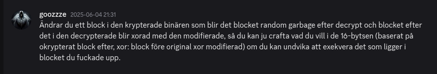 We’ll sacrifice one block (16 bytes) to act as our tool of control. By carefully crafting this block via XOR operations, we can make the decrypted output of the next block turn into whatever we want—or at least enough to redirect execution or inject something useful.