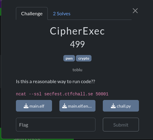 The challenge is called CipherExec, and it comes with pwn and crypto tags. A few files are available for download, along with connection details for the remote server. Only two people solved it. I know because I took this screenshot after being one of them. :)