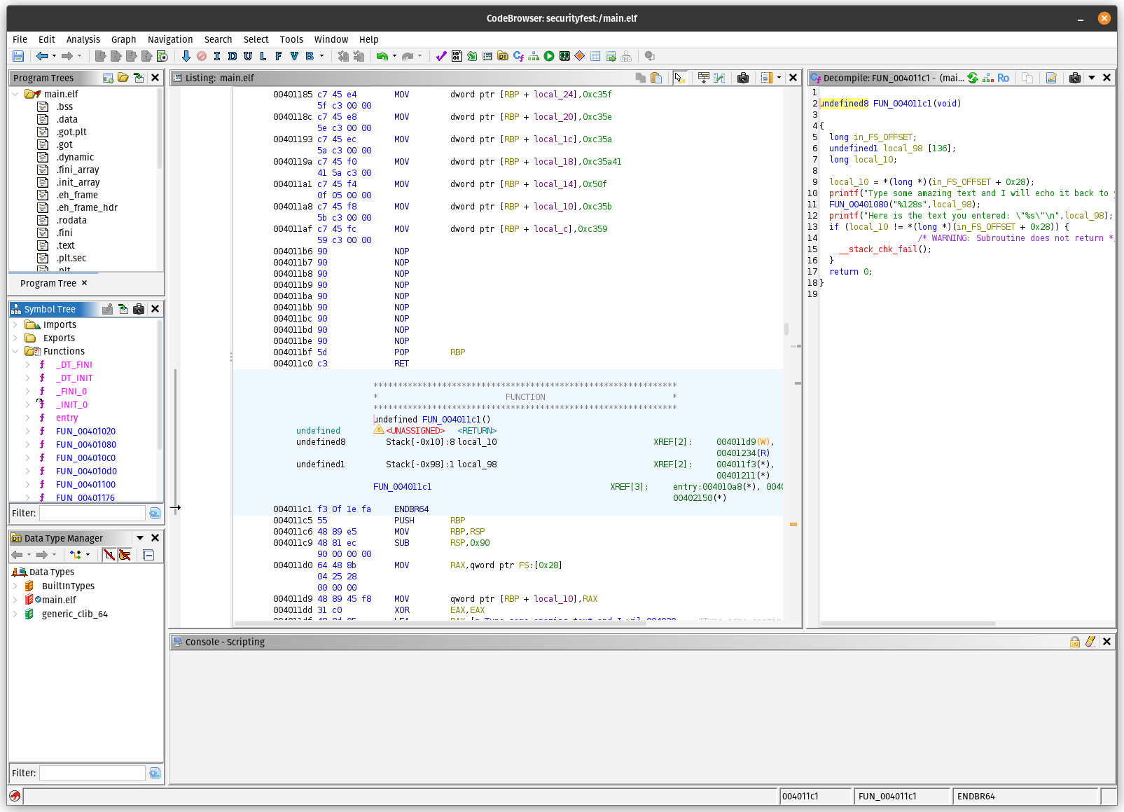 Nice, no PIE, which means all addresses are fixed and predictable. That’s one less layer of uncertainty. Let’s load this thing up in Ghidra so we can see what’s going on.