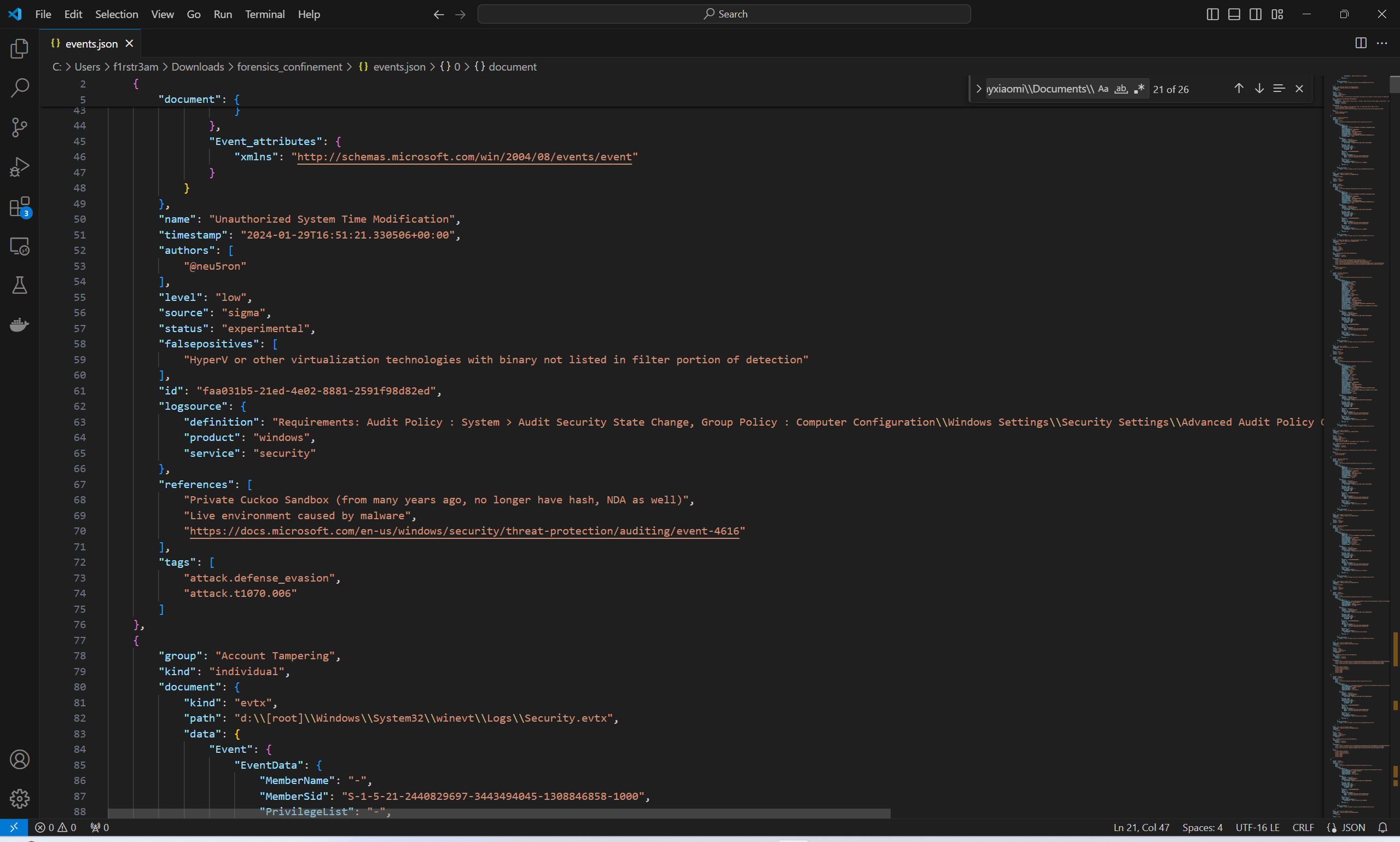 PS C:\Users\f1rstr3am\Downloads\forensics_confinement\chainsaw> .\chainsaw_x86_64-pc-windows-msvc.exe hunt -s .\sigma\ --mapping .\mappings\sigma-event-logs-all.yml -r .\rules\ 'd:\[root]\Windows\System32\winevt\Logs\' --json > ../events.json