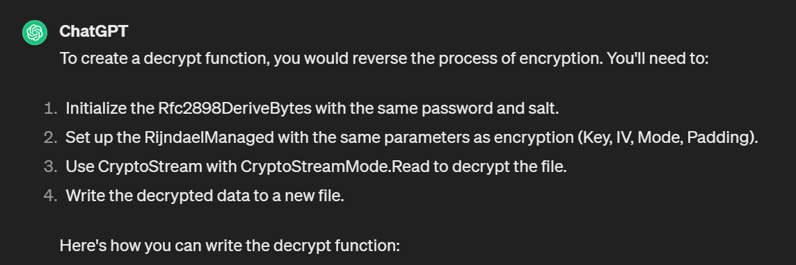 First of all we need a function that can decrypt the encrypted files. We could quite easily do that ourselves but this seems like a point where we could save some time by asking ChatGPT for some help.