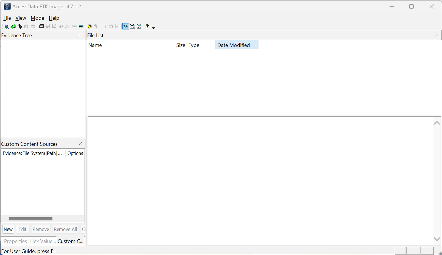 We are going to use FTK Imager which is available for free download from Exterros homepage. First of all we download and install the software. And once we start the application FTK Imager it looks like this.