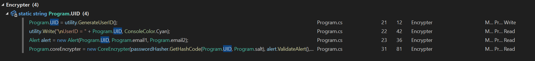 Let’s use a good function in Visual Studio to find all references of Program.UID. Mark the Program.UID and press CTRL + K + R. Visual Studio vill find every line of code referencing that variable.