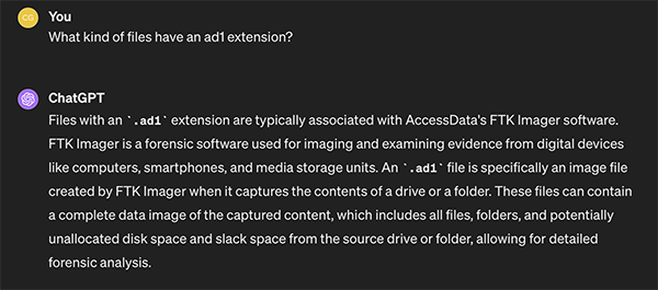 Inside there was a single file called Confinement.ad1. Experienced forensics probably know this already but just to be sure let’s see if our best friend ChatGPT can tell us what that AD1 extension stands for.