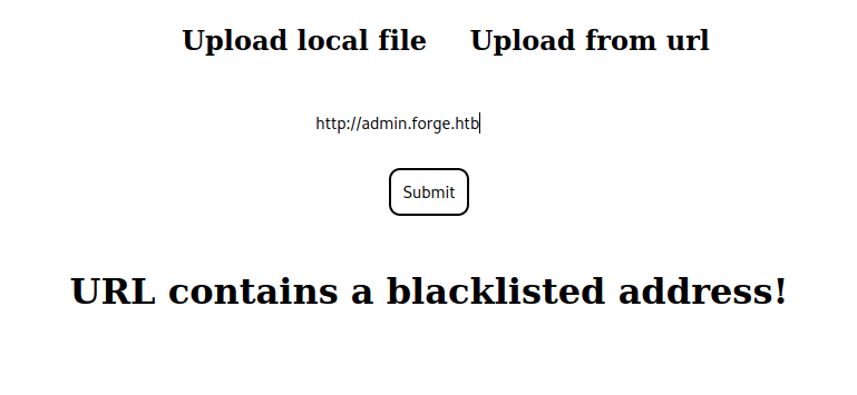 + http://forge.htb/upload (CODE:200|SIZE:929)