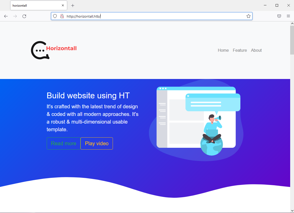 We are redirected to horizontall.htb. We need to put horizontall.htb in my hosts file. Let’s add a line like this: