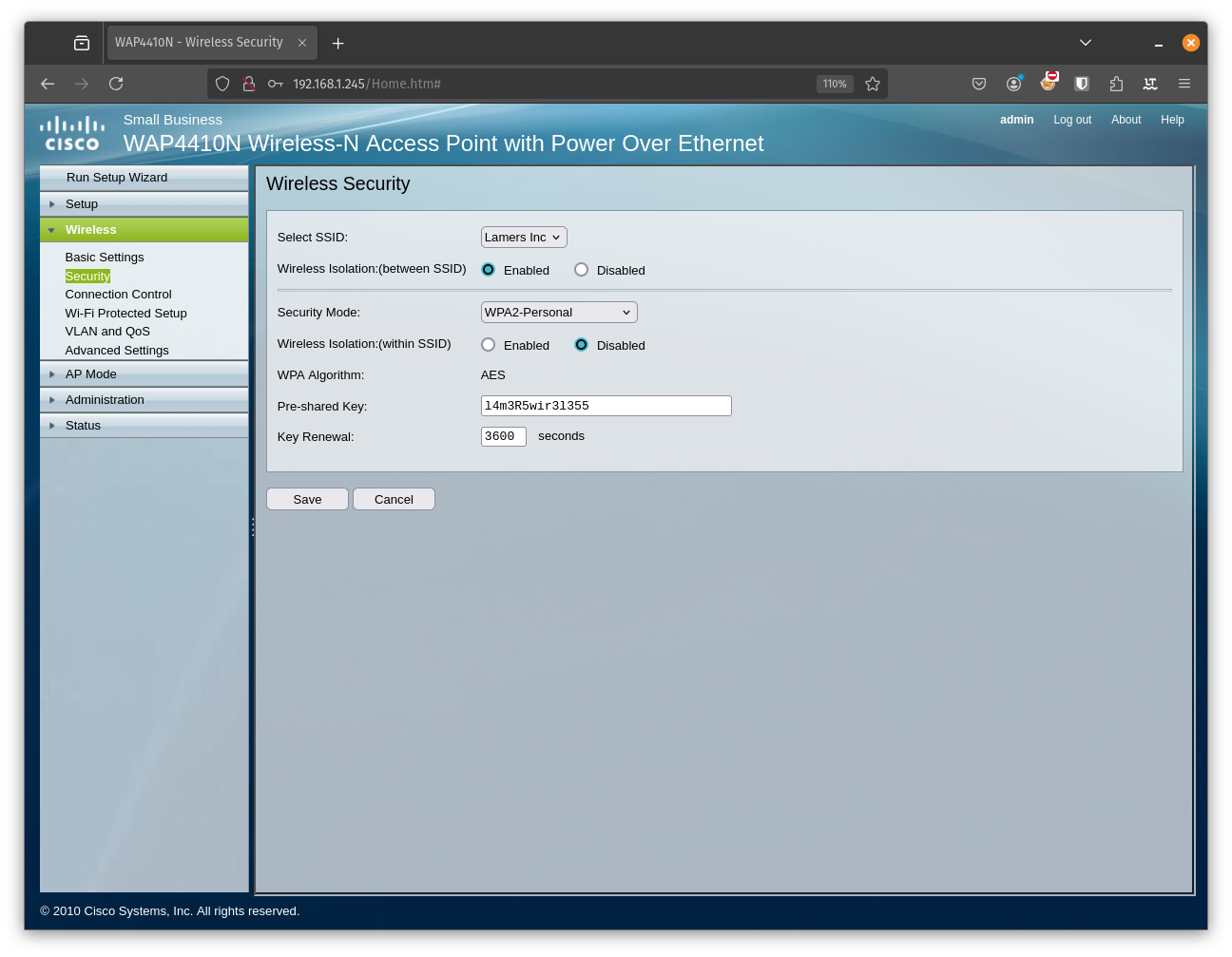 At this point I was a bit confused. This sucks so much. Ok this device is old, but not THAT old. You could at least expect that your passwords are protected by not storing them in clear text. Well if we head over to the wirless menu and the security section we can see even more interesting information.