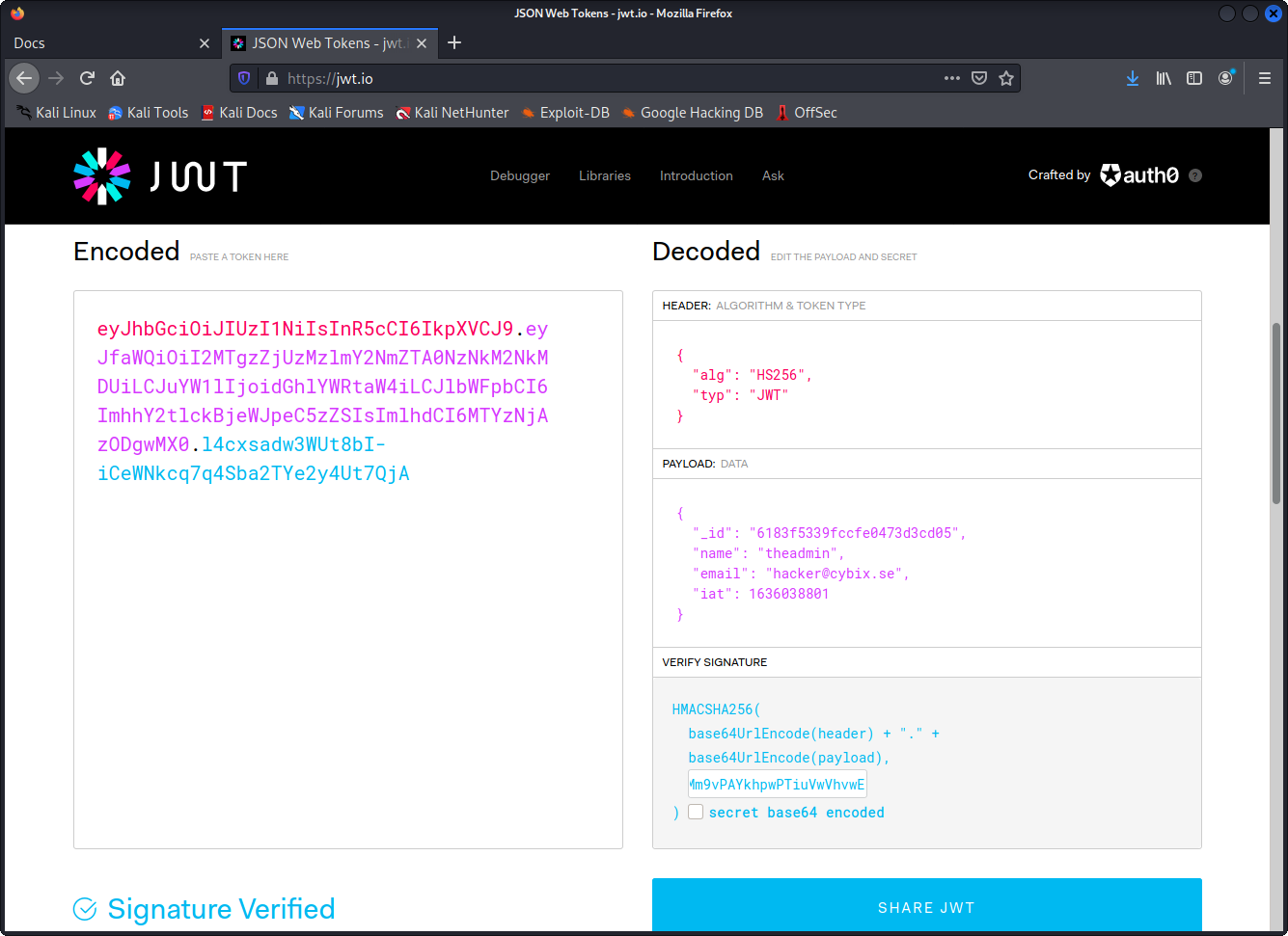 This writeup describes how I approached the box Secret from Hack The Box (https://www.hackthebox.eu). The box is based on Linux and it is rated easy. Tools and techniques used in this hack are Nmap, Dirb, Ffuf, Firefox, Burpsuite, Curl, Javascript, Git, JSon and JWT.