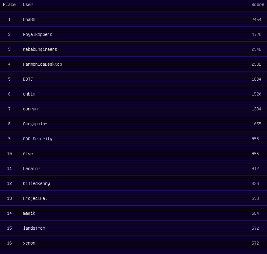 In the end we came in at 6th place in the CTF not solving more than a handful of challenges which kind of makes my point. Why put all that work into the challenges when almost no one solves them?