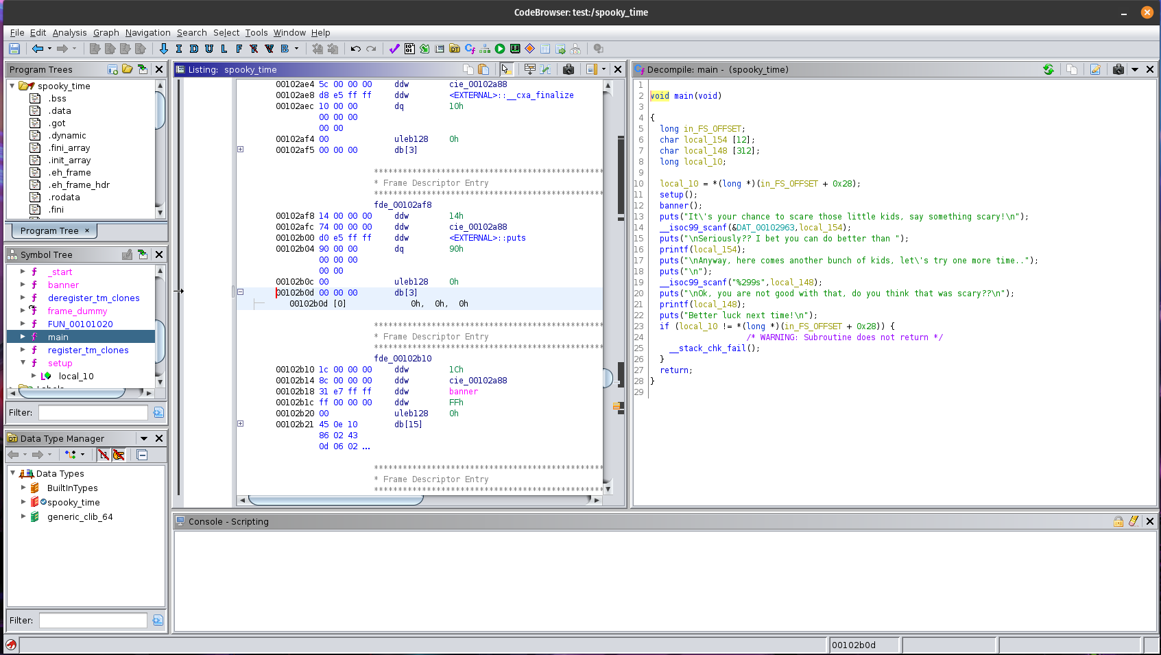 Let’s reverse engineer the spooky_time binary by loading it up the binary in Ghidra and see what we can find.