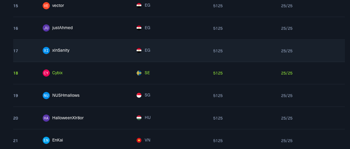 A big thank you to Hack The Box for another nice CTF. This was a one person per team CTF. I can say that I had a friend helping me out with the crypto stuff since that’s not really my ballpark. But with 5 new challenges every day I really had to push myself to finish all of them. Pwn takes time. At least for me. In the end I (representing Cybix) ended up in place 18 out of 6367 teams.